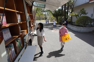 4月13日(木)の昼休みに、移動図書館「よむよむ号」が来校しました。