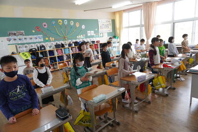 4月14日(金)の朝の会にお邪魔してみると、各学年で「校歌」を歌っていました。