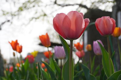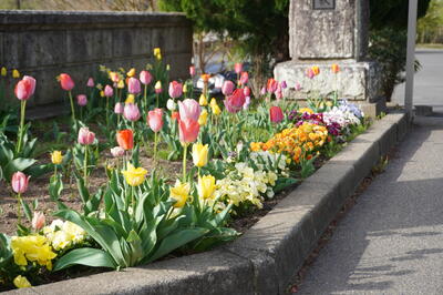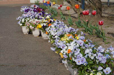 4月14日(金)、上校庭の花壇のパンジーやチューリップ、スイセンがきれいに咲いています。