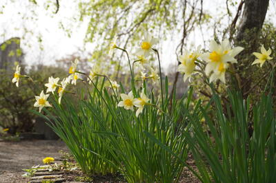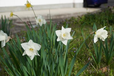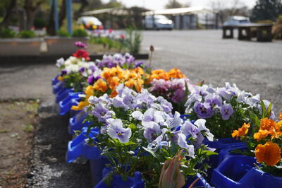 2023年4月14日 09時31分4月14日(金)、上校庭の花壇のパンジーやチューリップ、スイセンがきれいに咲いています。