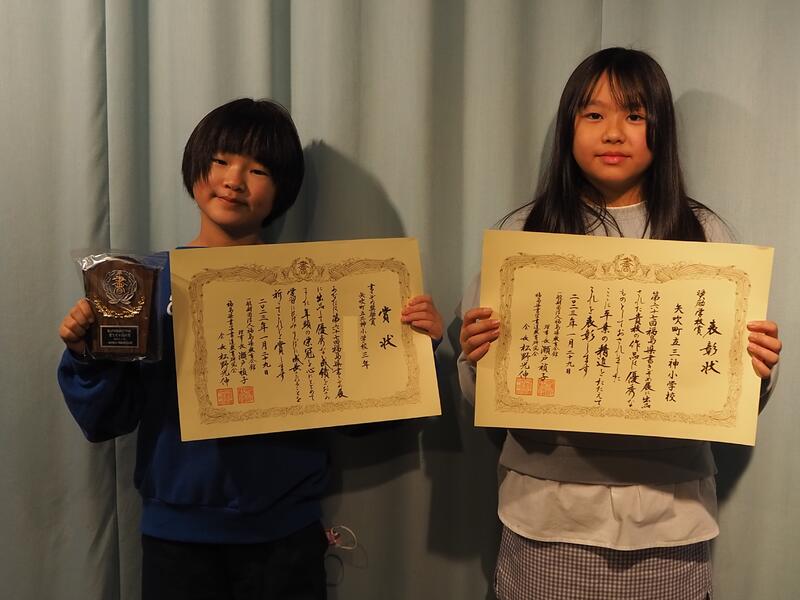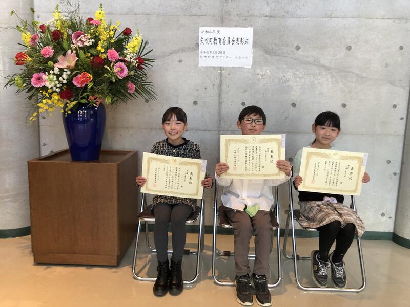 本校からは、3名が受賞対象となり、表彰式に参加しました。また、三神小学校としても賞状をいただきました。