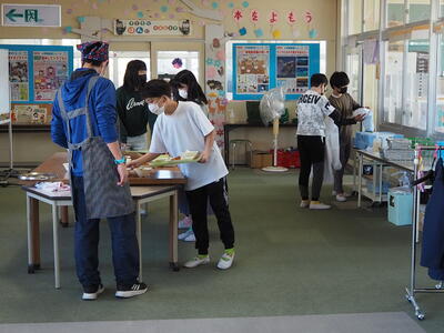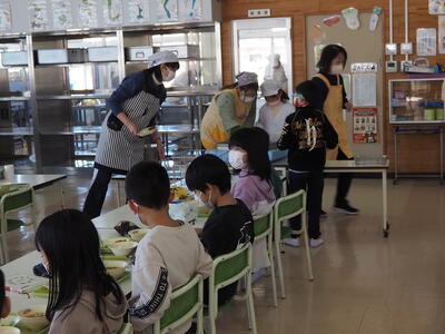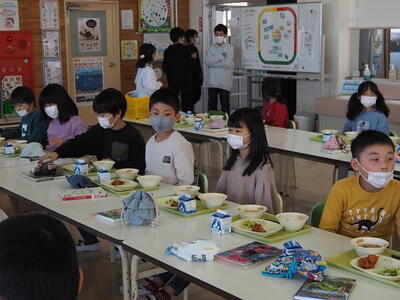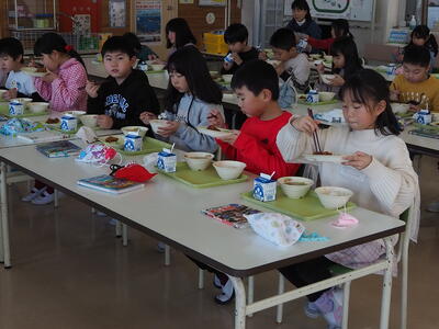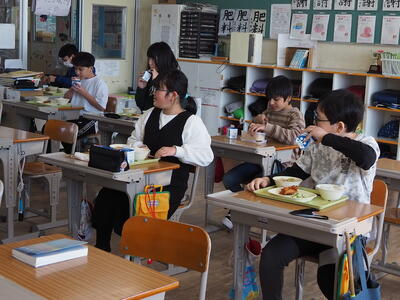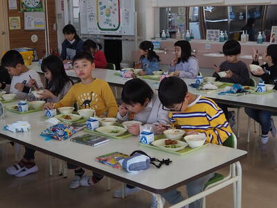 これは、来年度に向けて2年生が食堂給食に慣れるために実施したものです。そのため、3~5年生の食堂の座席も、来年度の席に移動して食べることとしました。
