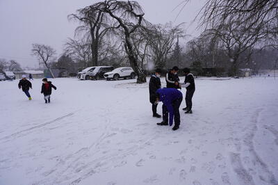 雪が積もったので、子どもたちが上校庭に出て来て、雪遊びをしていました。