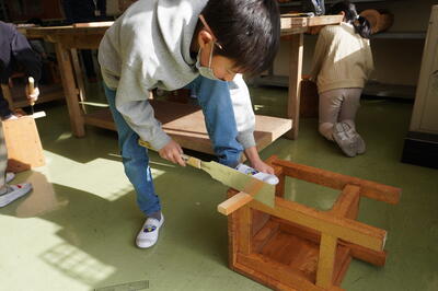 子どもたちは、のこぎりの使い方のコツをつかむと、色々な太さの木材を自分の好きな大きさに切っていきました。