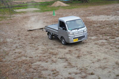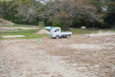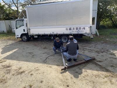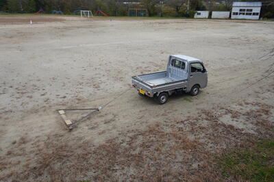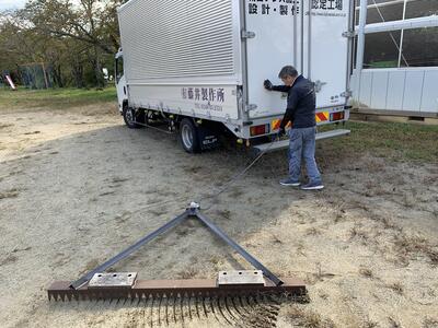 軽トラックで引いているレーキは、藤井製作所さんから寄贈していただいたものです。