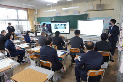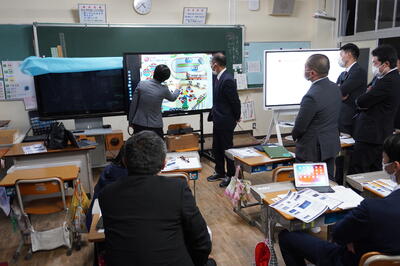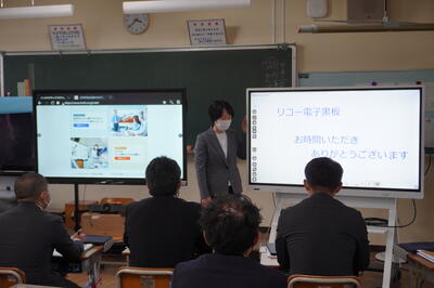 10月25日(火)の放課後、電子黒板利用説明会が本校を会場に行われました。矢吹町の小中学校から代表者が集まり、電子黒板を2台、4年生教室に搬入して電子黒板の特徴や使い方を説明していただきました。