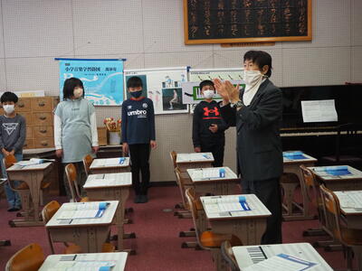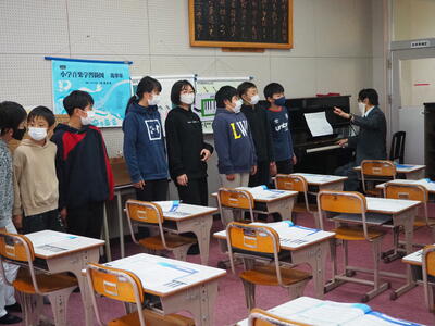 5年生は、「ハロー・シャイニングブルー」、6年生は「明日を信じて」の指導を行っていただきました。芳賀先生には、「エンジェル・ボイス」とたくさん褒めていただきました。