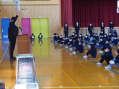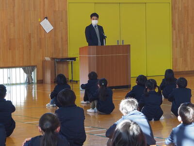 校長からは、2学期の子どもたちのがんばりを称賛すると共に、3学期に行われる「創立150周年記念式及び凧あげ大会」についての話がありました。