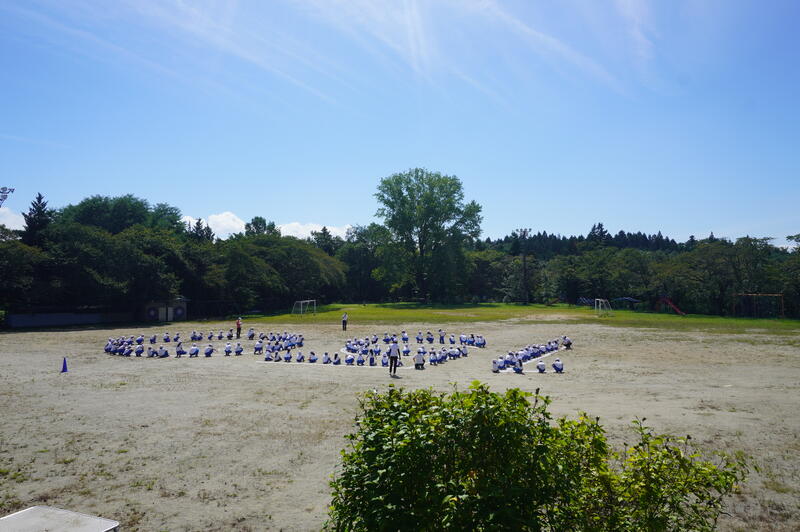 9月12日(月)、創立150周年を記念して航空写真を撮影しました。その際、撮影した写真です。斜め上の角度から撮影したのですが、青空のもと、子どもたちが選んだ「150」の人文字がきれいに写っています。