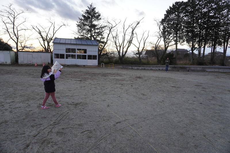 1月5日(木)、校庭で凧をあげている子どもがいたので、見に行ってみると、今日は、三神小の2年生の子でした。お父さんと一緒に凧あげをしていました。