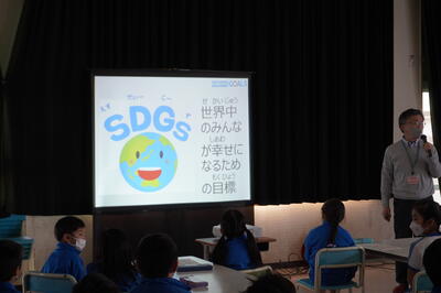 1月11日(水)の2校時目に、1・2年生がSDGsについて学習を行いました。講師として「矢吹町SDGs推進コーディネーター」の今村様をお迎えし、「食」をテーマにお話をしていただきました。
