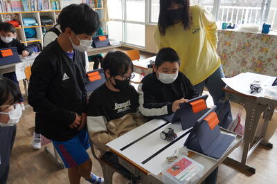 6年生は、マイクロビットを使って、マックイーン(マイクロビット用ロボットカー)を動かすプログラミングに挑戦しました。