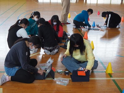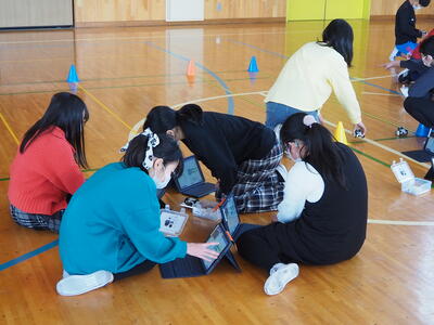 3校時目は、教室でマックイーンを走らせるための基本的なプログラミングを学び、4校時目は、体育館につくられたコースでマックイーンを走らせました。