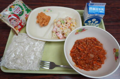 牛乳、ミートソース、クリスピーチキン、コールスローサラダ、クリスマスケーキ