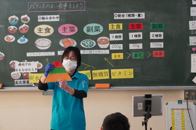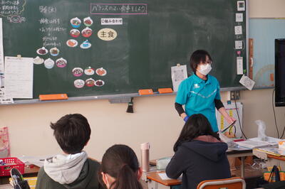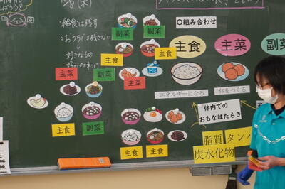 授業は、「バランスンの良い食事をしよう」ということで、紙上バイキングにチャレンジしながら、自分が選んだ料理やその理由を発表し合いました。