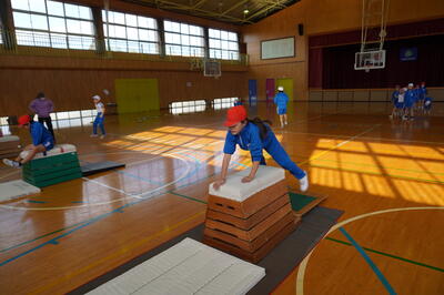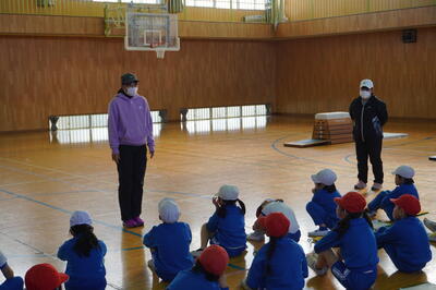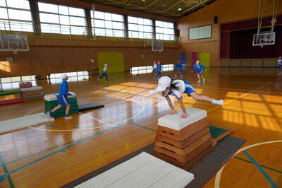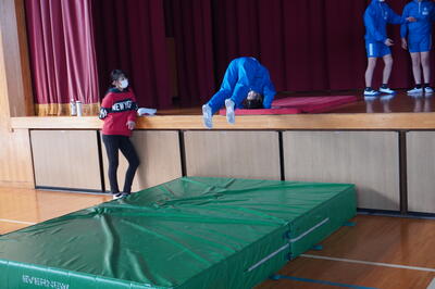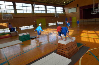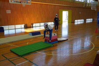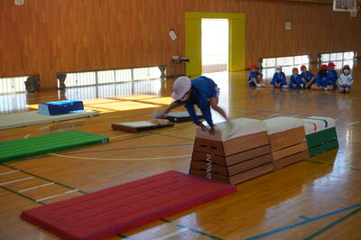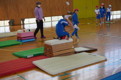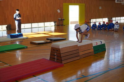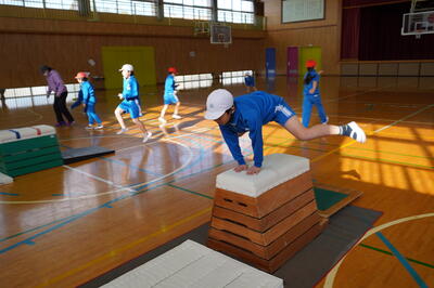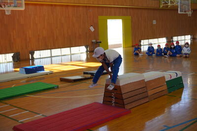 2年生は、開脚跳びやかかえこみ跳びにつながる動きを様々な場で練習していました。このような基本の動きが技の習得には、不可欠です。特に、腕で支持する動きが多く取り入れられていました。