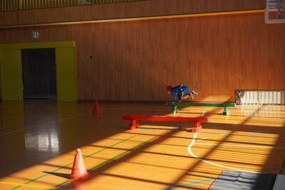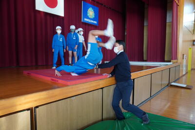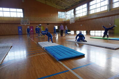 多様な場を作り、前転、後転、開脚後転、側方倒立回転、ネックスプリング等、様々な技に挑戦していました。