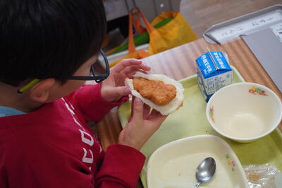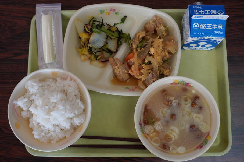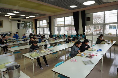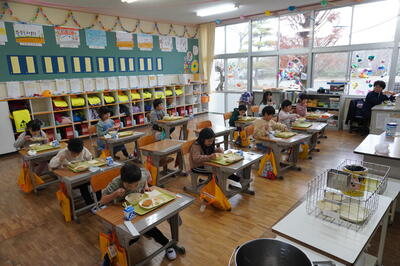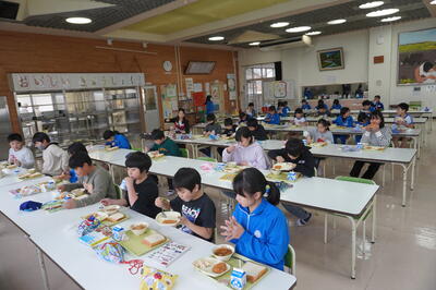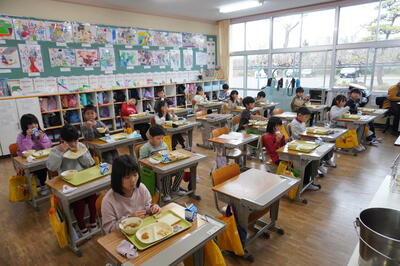 子どもたちは、食堂や教室でおいしそうに給食を食べていました。