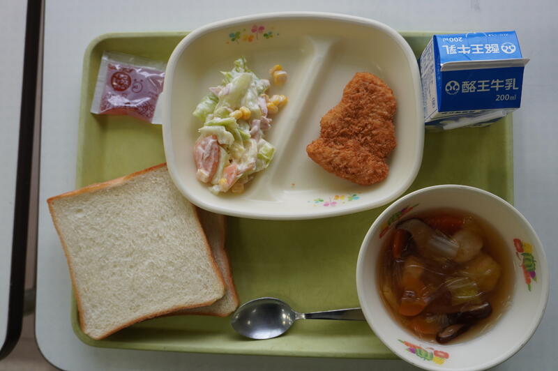 牛乳、しょくパン、エビボールスープ、コーンサラダ、もみの木メンチ、いちごジャム