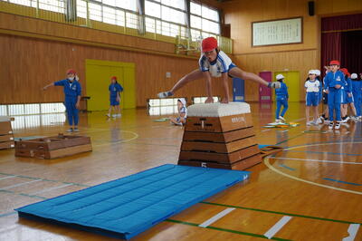 開脚跳びの4段、5段に挑戦している子どもたちの様子です。