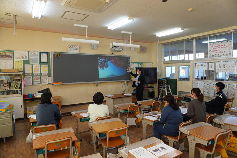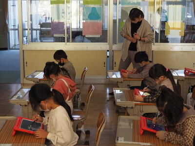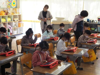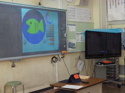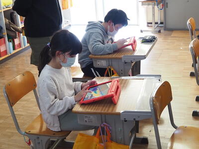 子どもたちは、海の中の生きものを自分で描き、それを動かすやり方を教えていただき、タブレット上でたくさん配置したり、動き方を工夫したりして楽しんでいました。