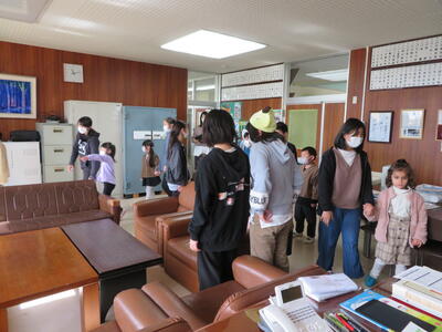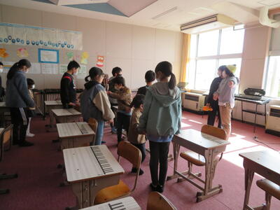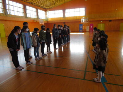 体育館で5年生と顔合わせを行い、5年生が校内の特別教室等を案内しました。