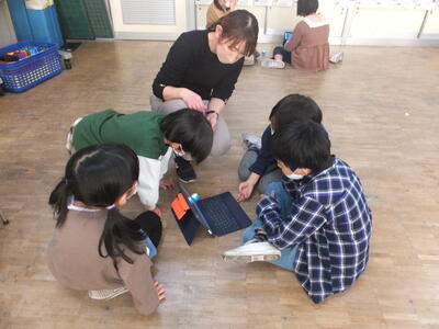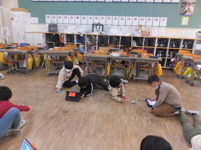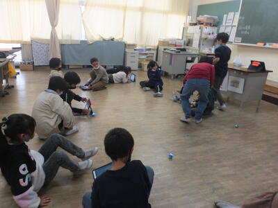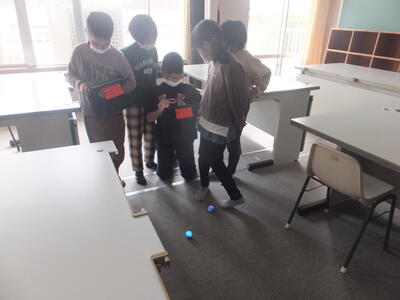 ICT支援員の関根さんに指導していただき、「スフィロ」という小型の球体ロボットをタブレットで操作する学習を行いました。クルクルと素早く動く「スフィロ」の動きが楽しくて大盛り上がりでした。