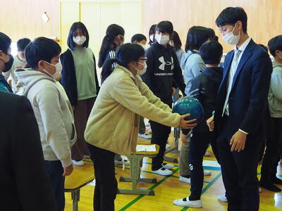 講話では、「自分の頭の重さを体験しよう」ということで、2㎏、3㎏、5㎏のボールを準備していただきました。頭の重さは、体重の約10%なので、自分の体重から頭の重さのボールを選び、頭が下がって悪い姿勢の時、どれほど首や肩に負担がかかっているか体験することができました。