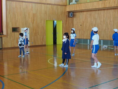 校長あいさつ、PTA会長あいさつのあと、「三神ストレッチ」を行いました。