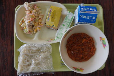 【献立の内容】牛乳、スパゲティミートソース、コールスローサラダ、クリスマスケーキ