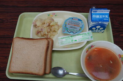 牛乳、黒糖食パン、ジャーマンポテト、ミネストローネ、歯の衛生週間ゼリー