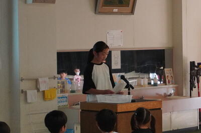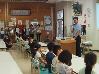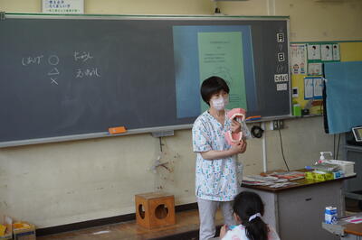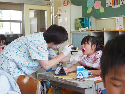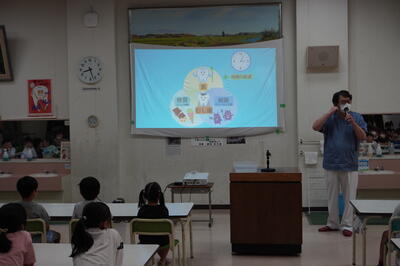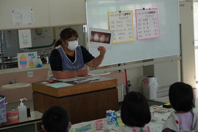 その後、学校歯科医の佐久間先生や校長先生より、むし歯にならないようにするためにはどうすればよいか、むし歯になってしまったら、早目に歯科医を受診することなどの話がありました。