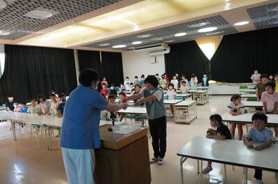 はじめに、4月の歯科検診でむし歯が1本もなかった子どもに「むし歯ゼロで賞」を、むし歯の治療が終わっている子どもに「よい歯で賞」の表彰を行いました。