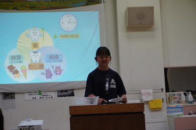 次に、保健委員会から「むし歯ができる原因」というクイズを交えた発表がありました。