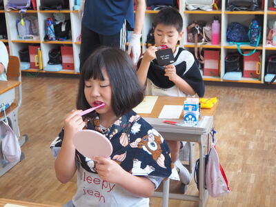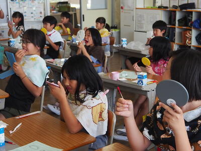 「鏡を見て前歯をしっかりみがこう!」というめあてで授業を行いました。