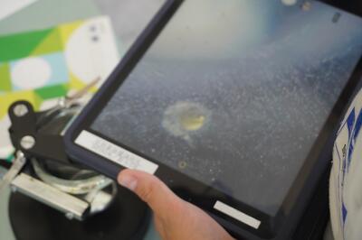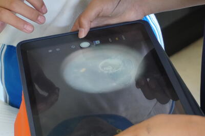 すると、ある子どもが解剖顕微鏡のレンズの部分をタブレットで撮影し始めました。