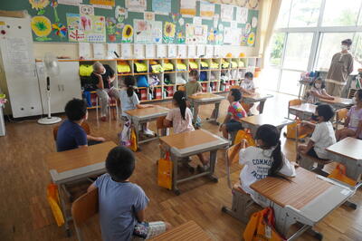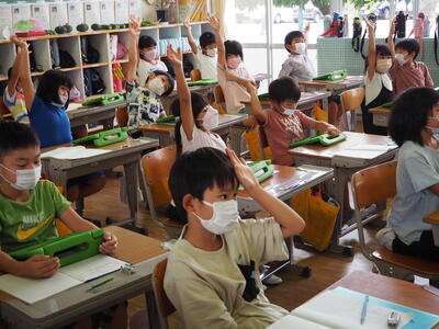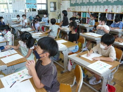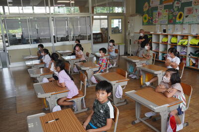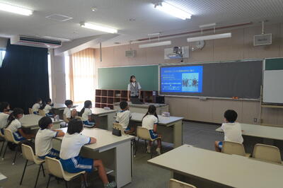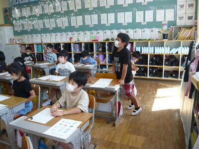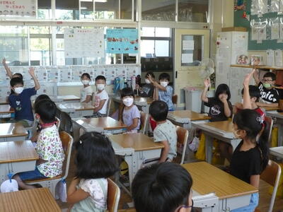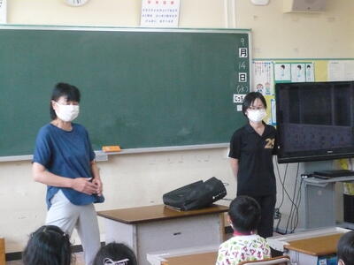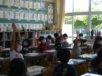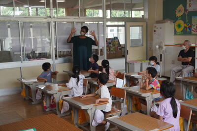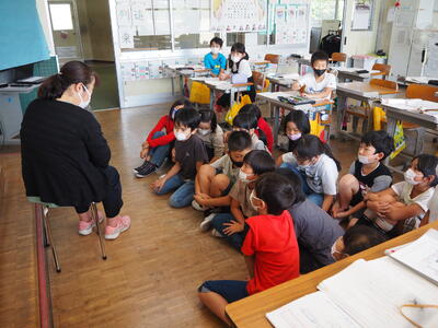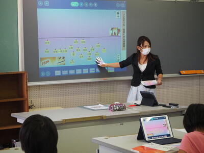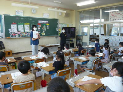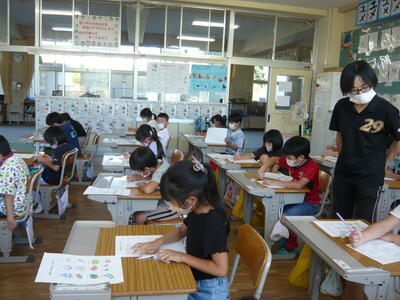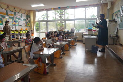 9月13日(火)の5校時目に1年生がエイシャ先生と外国語活動の授業を行っていました。1・2年生は、生活科で年間10時間程度、外国語活動を行っています。