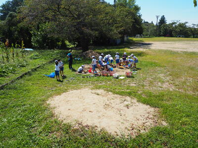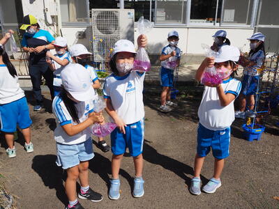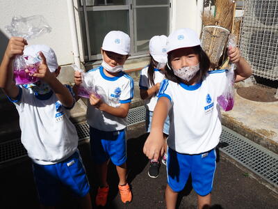 9月14日(水)の2校時目に、1年生が生活科の授業で「色水づくり、砂遊び」を行っていました。