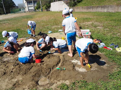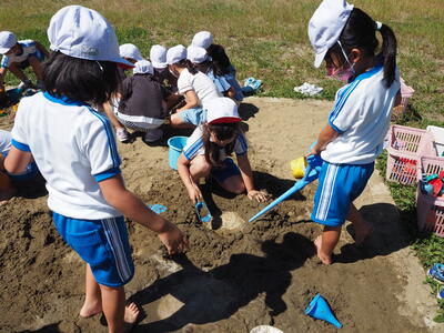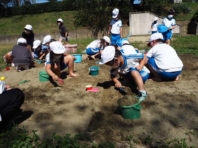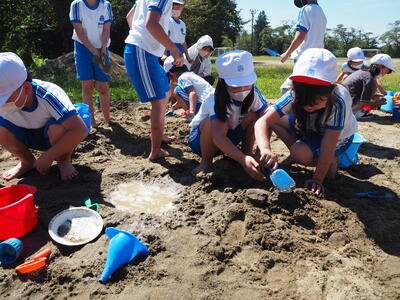 1年生の子どもたちは、砂場に行くと裸足になり、気持ちよさそうに砂遊びを楽しんでいました。