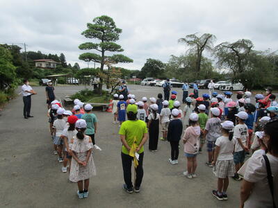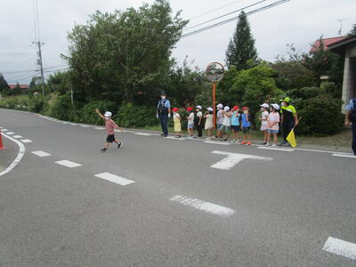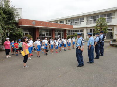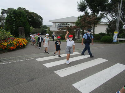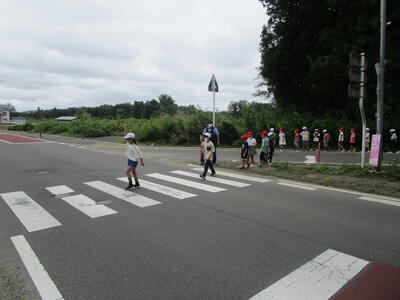 1・2年生は、学校周辺の道路を歩いたり、横断歩道を渡ったりしながら、安全な歩行について学習しました。