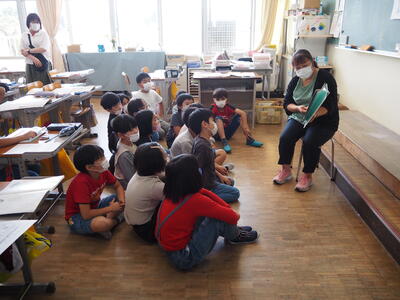 写真は、担任が「えんぴつびな」という本の読み聞かせを行っているところです。