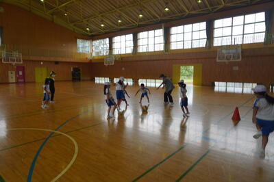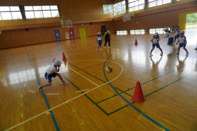 前半に「なわとび」を行い、後半は、「転がしドッジボール」を行っていました。