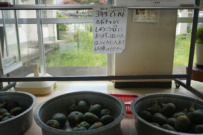 「カボチャがほしい人は、昇降口に置いておきますので、袋に入れて持って帰ってください。」と放送していました。