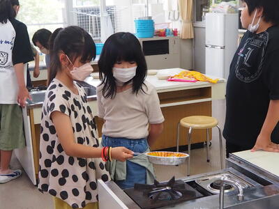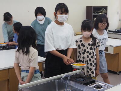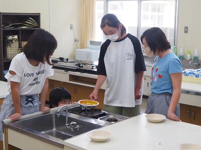 写真は、家庭科クラブで「ポップコーンづくり」をしている様子です。
