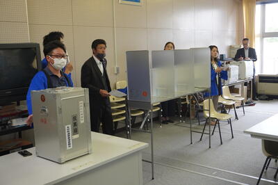 実際に投票に使う記入台や投票箱を使って行いました。