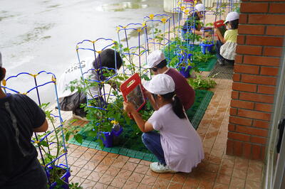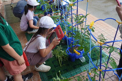 芽かきが終わると、子どもたちは、自分のトマトをタブレットで撮影していました。