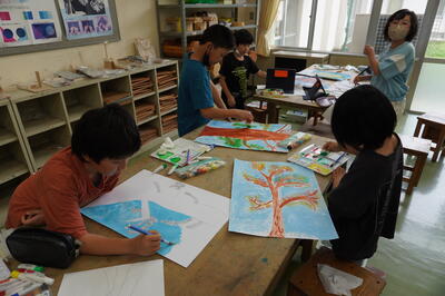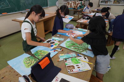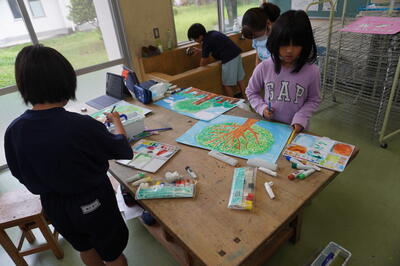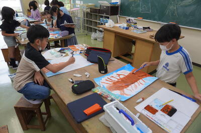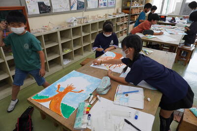 「イメージにあった表現方法を使って、色づくりや筆使いを工夫して作品をつくろう。」というめあてで、工夫して色塗りをしていました。