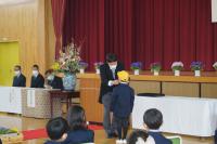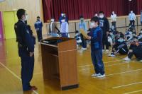 その後、6年生に委嘱状が交付され、代表児童が署員さんから受け取りました。代表で「交通安全のきまりを守り、みんなのお手本になります。」「弟や妹、おじいさん、おばあさんなど、みんなに交通のきまりを守るよう声をかけます。」など4つの実行することを読み上げました。