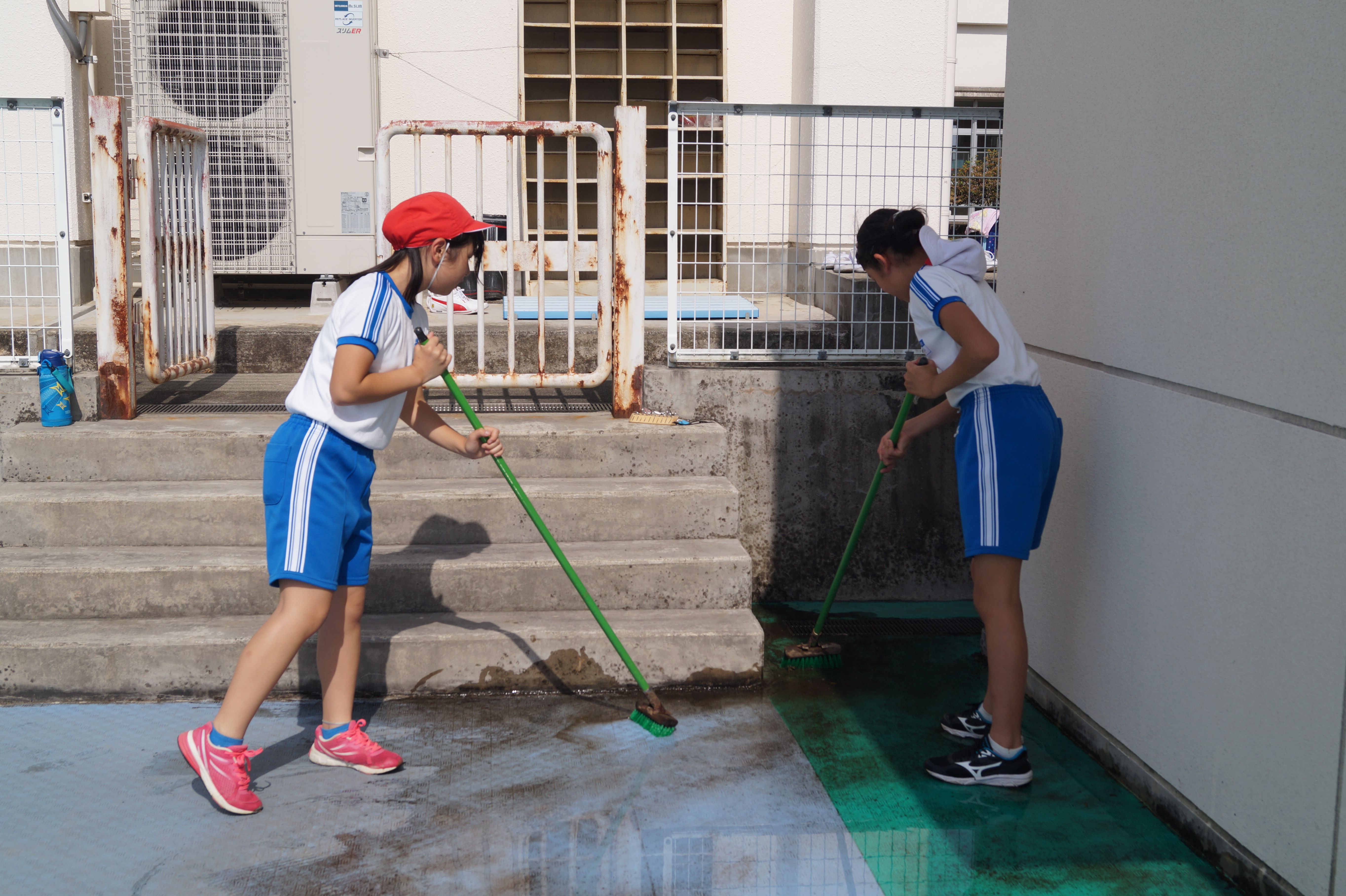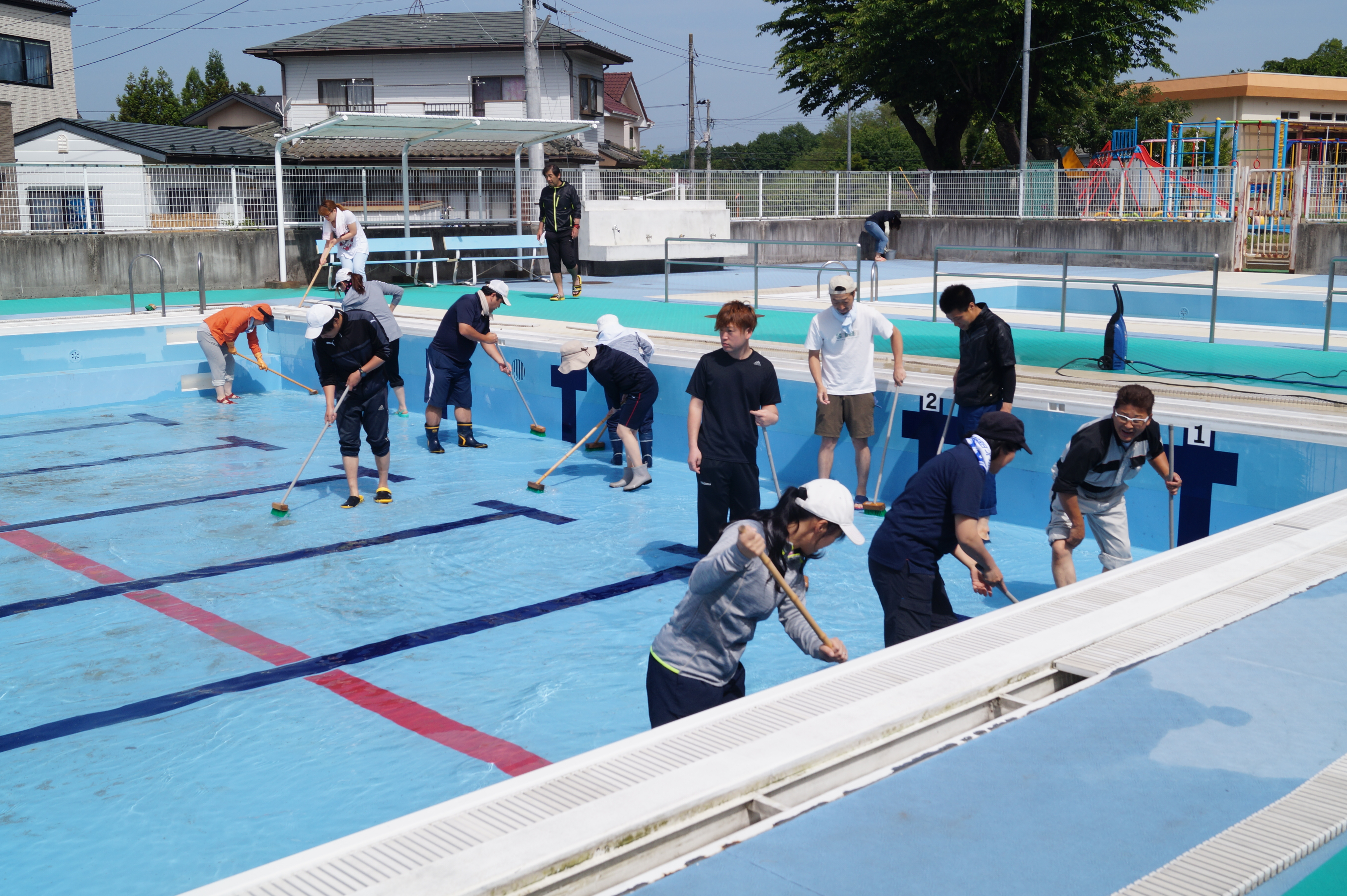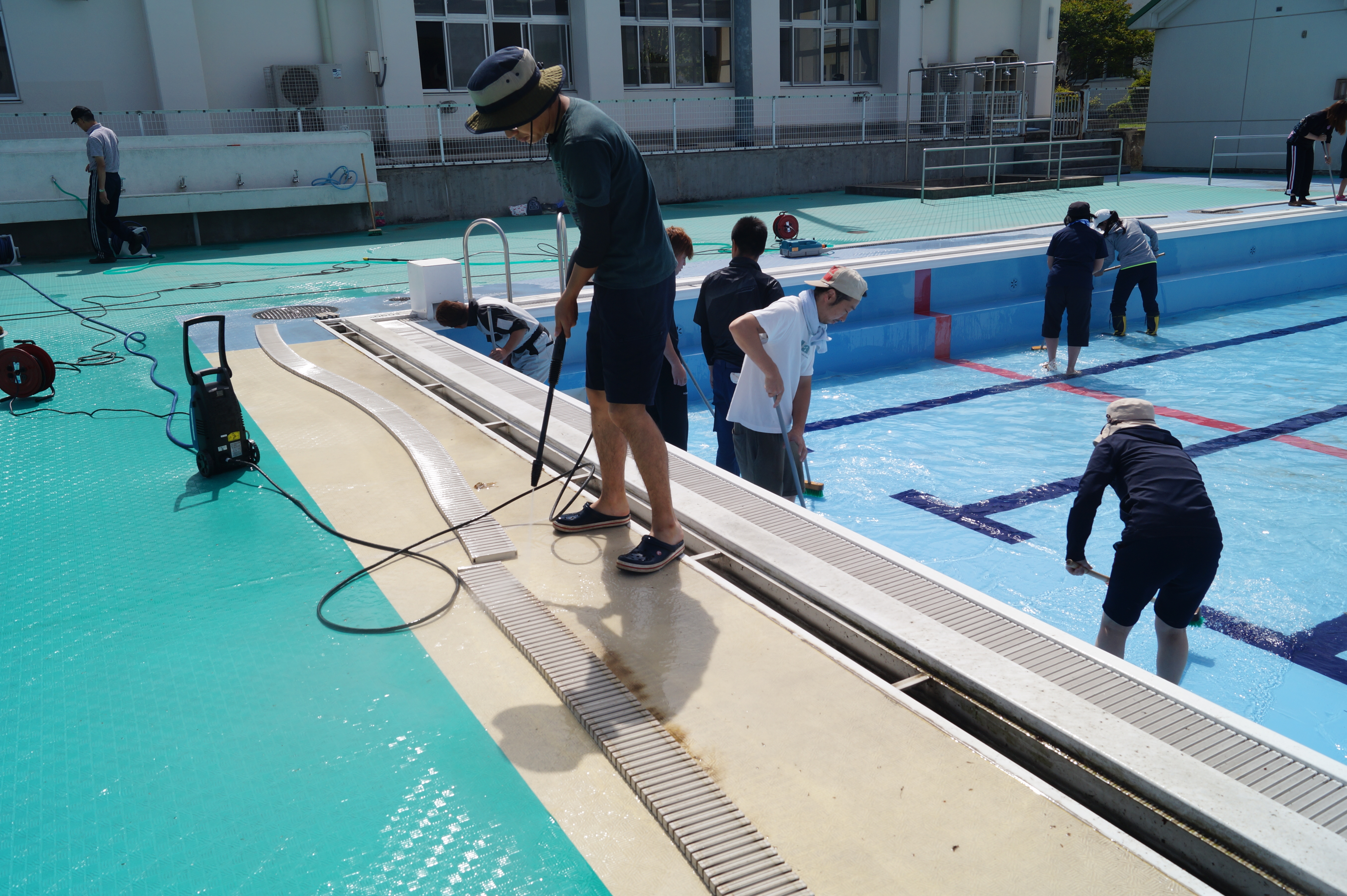 プールに併設するトイレや更衣室を中心に、デッキブラシなどの道具を使い、重点的にきれいにしました。