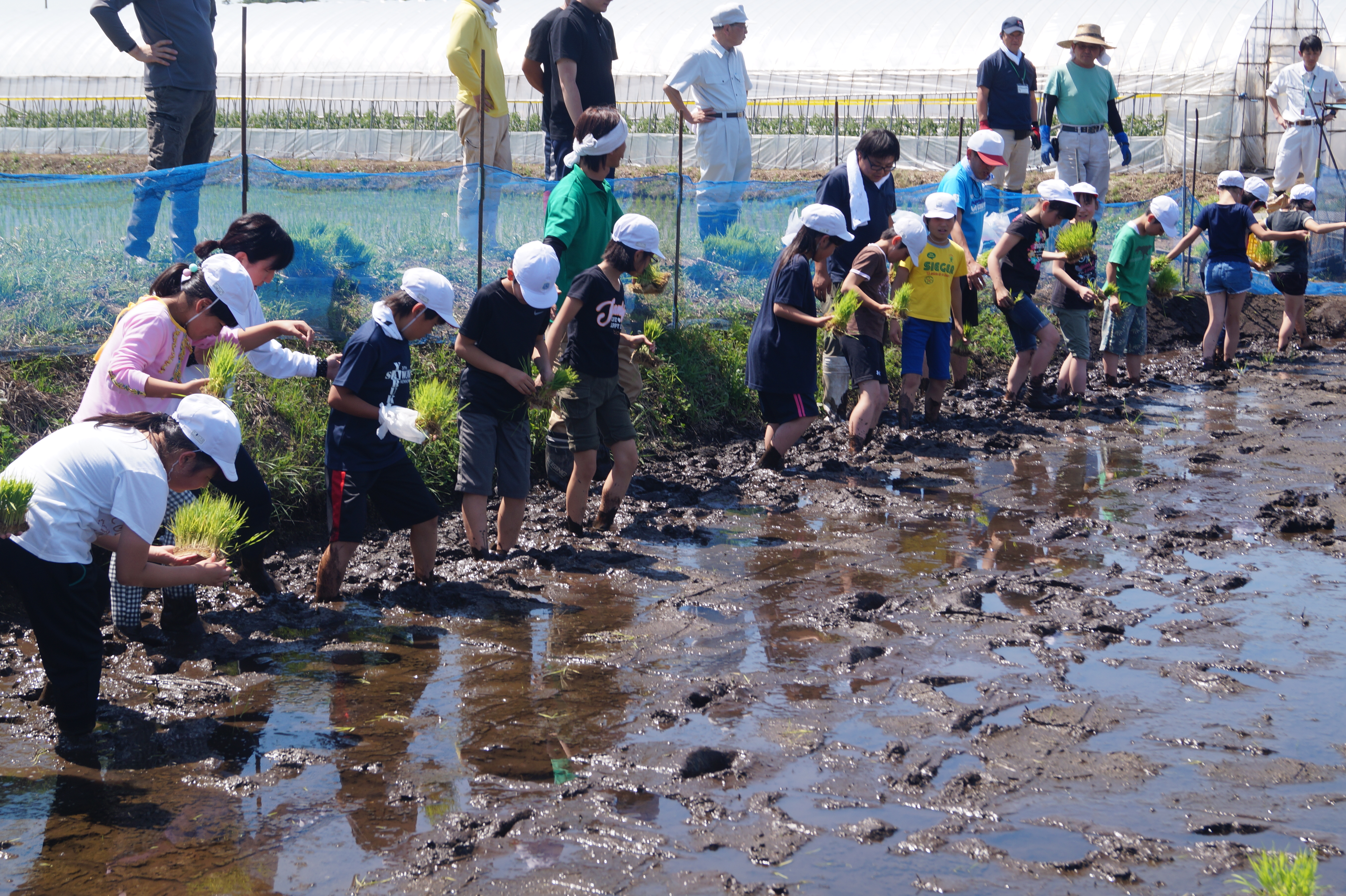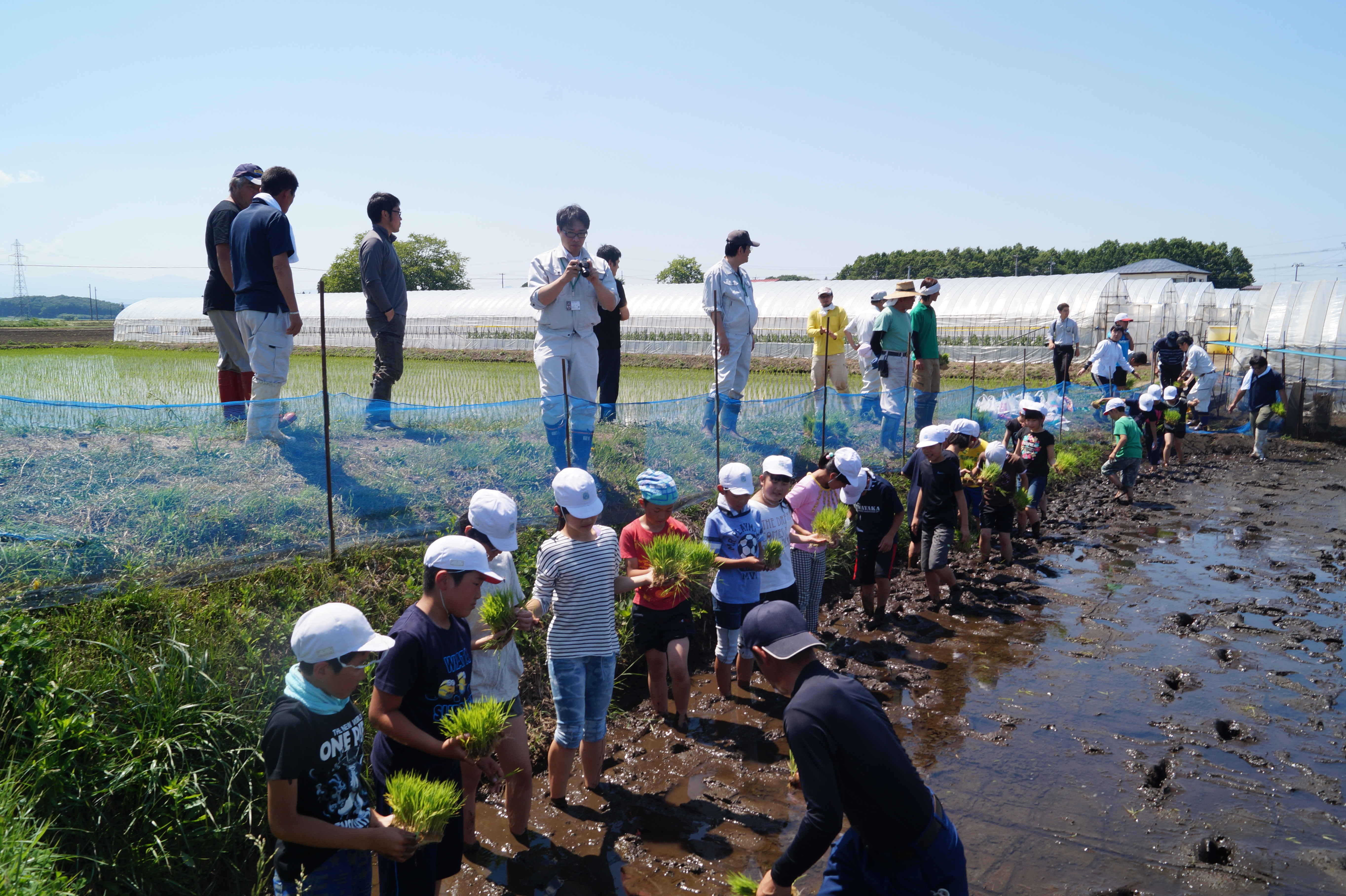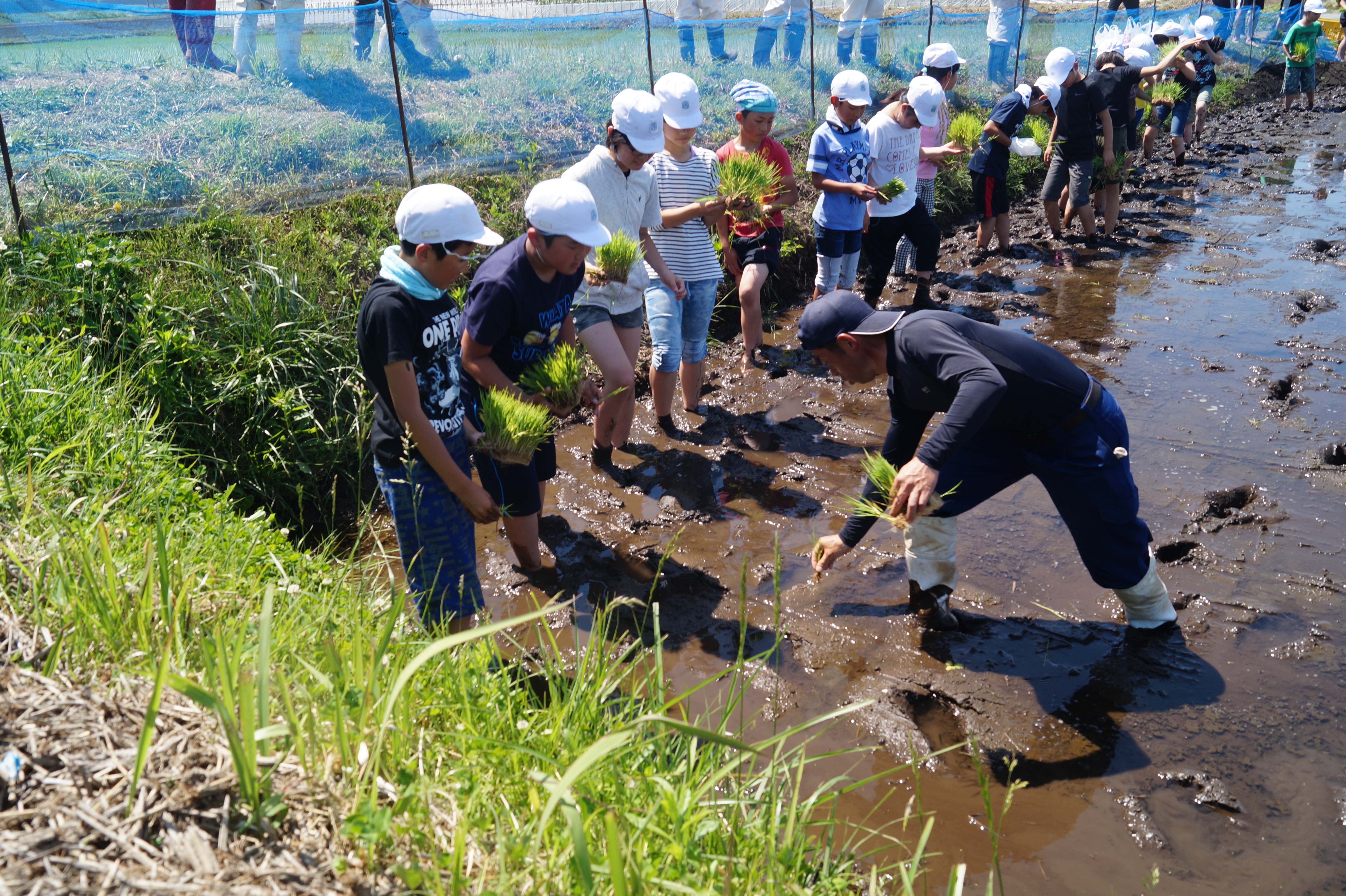 田植えの前は、「田植えが楽しみだな」「苗を上手に植えることはできるのかな」など意欲的な声が聞こえました。また、実際にやってみると、歓声をあげながら泥の感触を楽しみ、苗の植え方のコツをつかんで、上手に植えることができました。それと同時に、「腰が痛くなってきた」「農家の人は疲れるな」など自分たちで苗を植える体験を通して、農作業の大変さも感じたようでした。